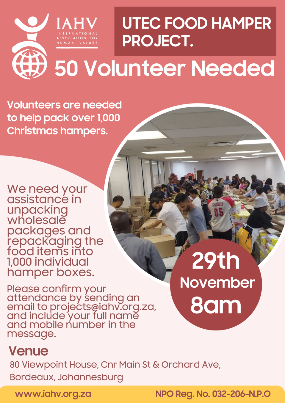 We need 50 volunteers to assist in unpacking wholesale packages and repackaging the food items into 1,000 individual hamper boxes in Randburg, JHB, on the 29th of November 2025.
