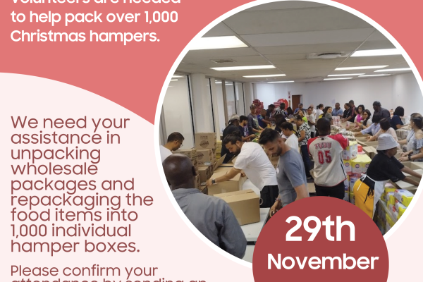 We need 50 volunteers to assist in unpacking wholesale packages and repackaging the food items into 1,000 individual hamper boxes in Randburg, JHB, on the 29th of November 2025. Please…